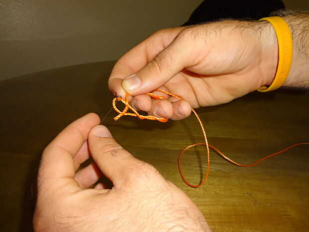 El siguiente paso puede ser un poco complicado. Enrosque el extremo abierto de la línea a través del bucle que acaba de hacer en la parte superior del orificio del ojo. Por lo general envolverá la parte torcida de mi línea de alrededor de dos dedos para mantener el giro apretado para que no se desentraña.