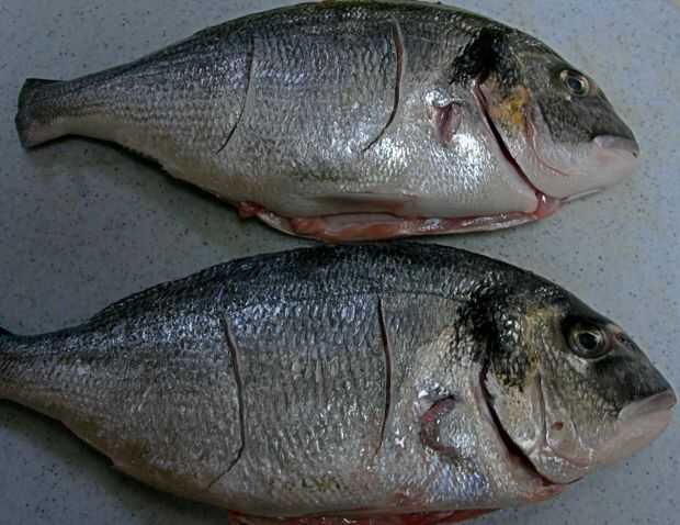 Dar a los peces un enjuague rápido dentro y por fuera con agua fría. Hacer dos puntuaciones a cada lado de los pescados limpios, escalados.
