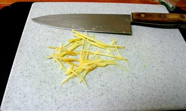 Finamente en juliana el resto de pedazo de jengibre. Hacer tan delgado como sea posible.