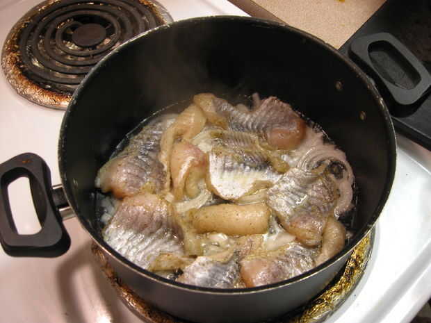 Una vez que el pescado pone un poco blanco, como se muestra en la imagen, añadir la salsa marinada para it. Esto se hace para dar la máxima cantidad de sabor a los pescados además del proceso de marinado. La esencia del sabor se encuentra en la salsa, por lo que es un ingrediente importante. Cuando realmente lo agregue, tal vez encuentre que hay probablemente muy poco. Así, puede añadirse un poco de agua a la salsa para capturar completamente todas las especias restantes. No agregue demasiado aunque!