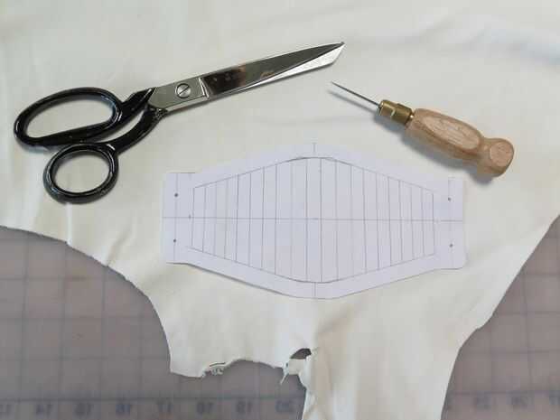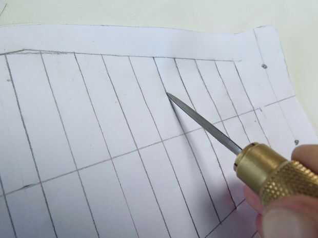 Grabado mi patrón de papel hacia abajo suavemente en el cuero que iba a ser mi capa superior y luego trazó el contorno con un punzón. Para transferencia interna cortar líneas que trazó derecha sobre el papel con mi punzón, presionando hacia abajo bastante difícilmente para asegurarse las líneas estaban claramente definidas.
