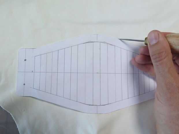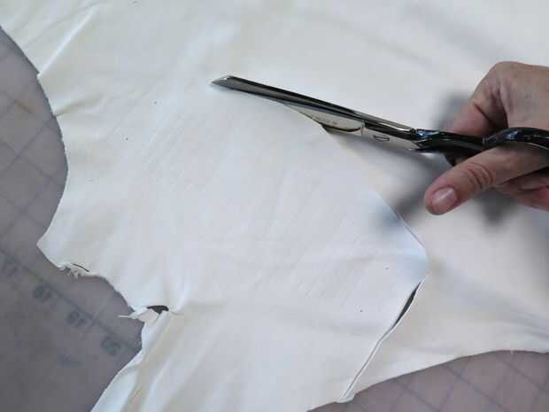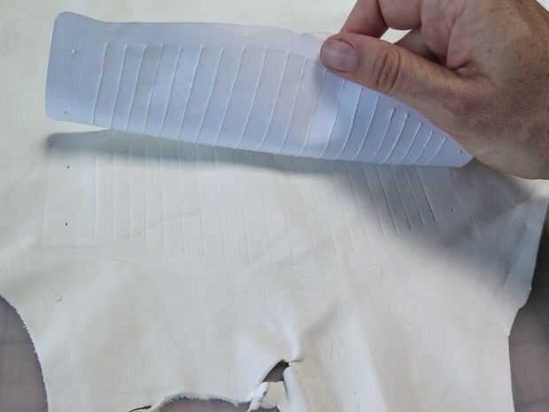 Cuando terminé comprobé que mis líneas habían transferido y luego cortar la pieza con unas tijeras afiladas, dejando aproximadamente 1/2" de la piel sobrante alrededor del contorno.