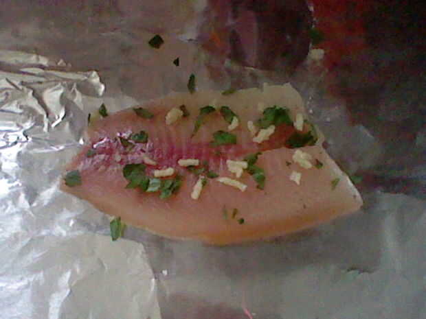 Pique ajo y picamos unas hojas de perejil. Coloque encima el pescado.