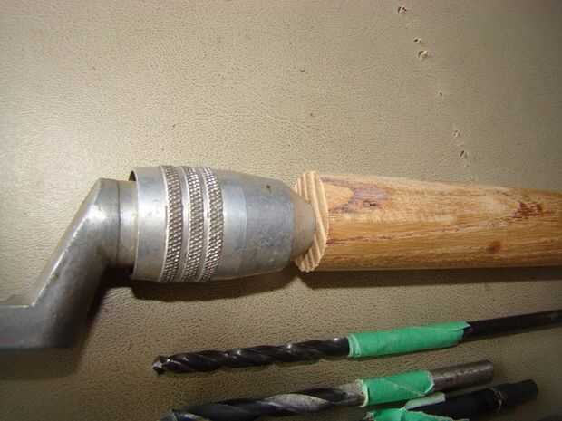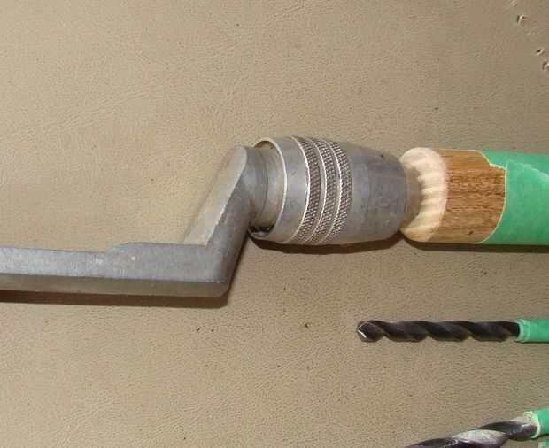 Luego se perforaron agujeros en las piezas del mango y la parte inferior de la caña. Esta es una de esas veces cuando acabo de hacer el trabajo sin parar para sacar fotos... He usado brocas progresivamente más grandes, hasta que el agujero era apenas el tamaño correcto. Marqué los pedacitos con cinta para evitar taladrar demasiado lejos.