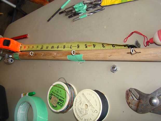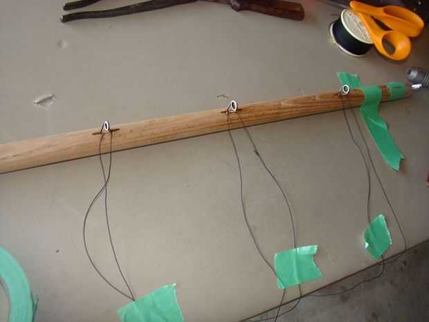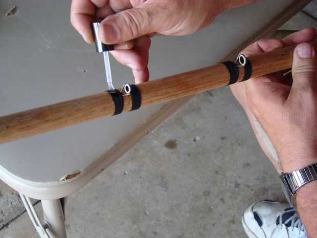 Tres ojales de la vieja barra de pesca estaban pegados en la parte inferior de la caña de madera. Antes de pegarlos en, temporalmente conecté el mango y hacer girar la pieza de madera varias veces para ver cómo se ve mejor. No importa lo cuidadoso que perforar, el agujero nunca es perfectamente recto. Así que cuando me encuentre la posición que se ve mejor, utilizo un trozo de cinta y un lápiz para marcar la línea que quiero los ojales en.