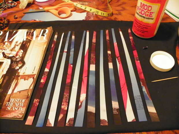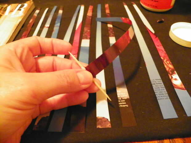 Arrancarle unas pocas páginas de una revista. Cortar en tiras de 10-1/2" de largo 1/2" de ancho en un extremo y 1/4" de ancho en el extremo opuesto. Comience con el extremo ancho de 1/2" y comenzar a envolver alrededor de un palillo de dientes. al llegar a aproximadamente 1/3 de la banda envuelto, aplique una pequeña cantidad de pegamento con un q-Tip en el resto de la banda y continuar envoltorio hasta que esté todo el palillo de dientes. Toma un par antes de obtener el cuelgue de ella. Tenga cuidado de no conseguir cualquier pegamento en el palillo de dientes. Deslice el talón el palillo de dientes y conjunto sobre papel encerado y deje para secar. Hice sobre 65-70 granos para mi collar, cadena en hilo dental hasta que tenga la longitud que desee. atar los extremos con un nudo. Me gusta hacer cuando estoy viendo TV.