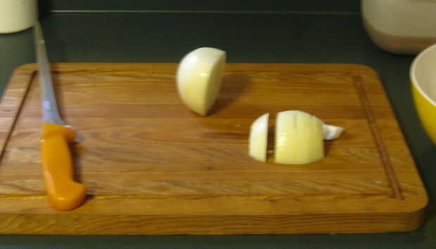 1. 1 cebolla grande cortar en cuadritos y colocar en un recipiente, aproximadamente dos tazas.