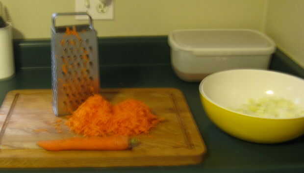 2. Rallar las zanahorias de buen tamaño de 2 a 3 y coloque en un tazón aproximadamente 4 tazas.
