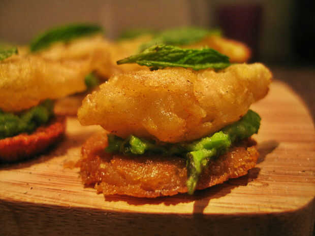 en una porción tablero Coloque primero sus Papa Galletas/bizcochos en hileras, seguido por usted puré de arveja (guisantes blandos) luego coloque cuidadosamente hacia abajo el pescado rebozado en la parte superior. Finalmente tapa con puntas de hojas de menta y sal y pimienta.
