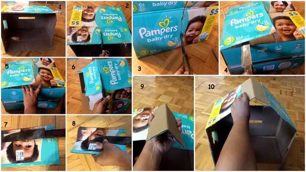 1) en la pared frontal de la caja, hacer una hendidura en el centro y la base por lo que se abre como una puerta en el frente. Esta es la parte delantera de la cuna.