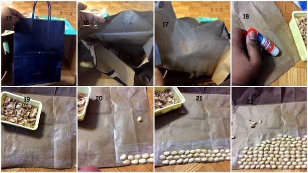 5) utilizar el pegamento y pegar cáscaras de pistacho en el papel.