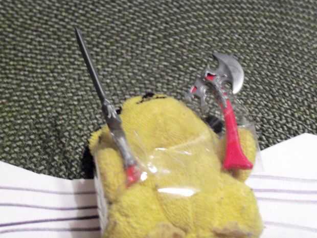 Cinta dos armas a la felpa. Las armas a los brazos de la felpa de la cinta. Si desea, puede pegar las armas en.