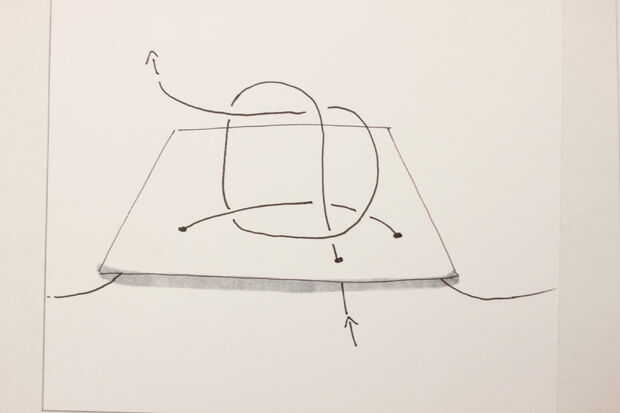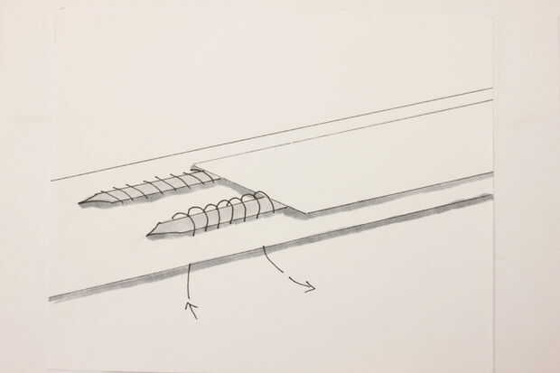 Cuadro 8: Atar un hilo a una puntada existente para combinar hilos (flechas negras en el esquema).