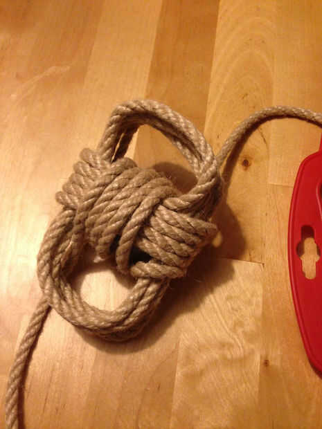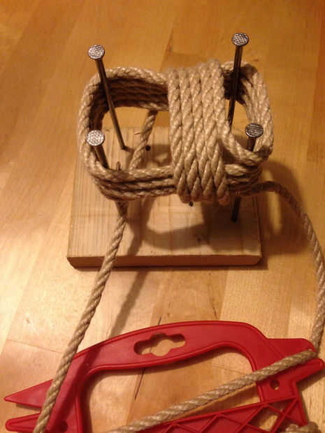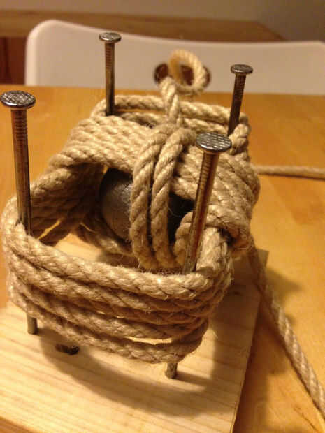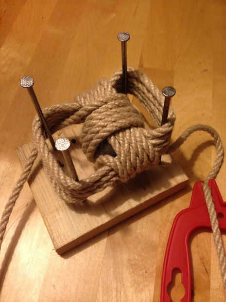 Una vez que comienza el nudo, habrá un cierto paso donde tienes que colocar el peso en el centro. Meter la bola dentro y proceder a atar el puño. Prestar atención no a que sea demasiado ajustado y apretado alrededor de las uñas, ya que sería difícil de quitar la cuerda de la plantilla. Una vez terminadas todas las bobinas, se salga el nudo de las uñas.