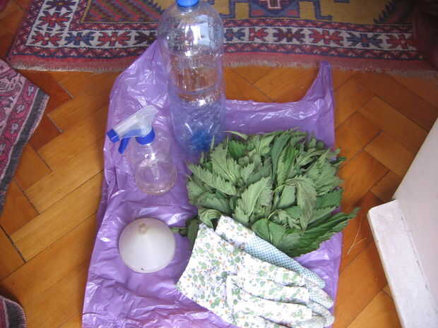 Todo lo que necesita es una mano completa de ortiga común, botella de 1.5L y agua. Más adelante será necesario un filtro de café, un embudo y un pulverizador (para rociar las plantas).
