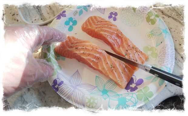 Los grandes filetes de salmón pueden acabar un poco cruda en el centro y recargada en los bordes. Rebanar los en medio ayuda a cocinar el pescado uniformemente. Normalmente un adulto comerá 2 de los filetes más pequeño, pero agradable para control de porciones tener la capacidad de tomar solo 1 si se prefiere.