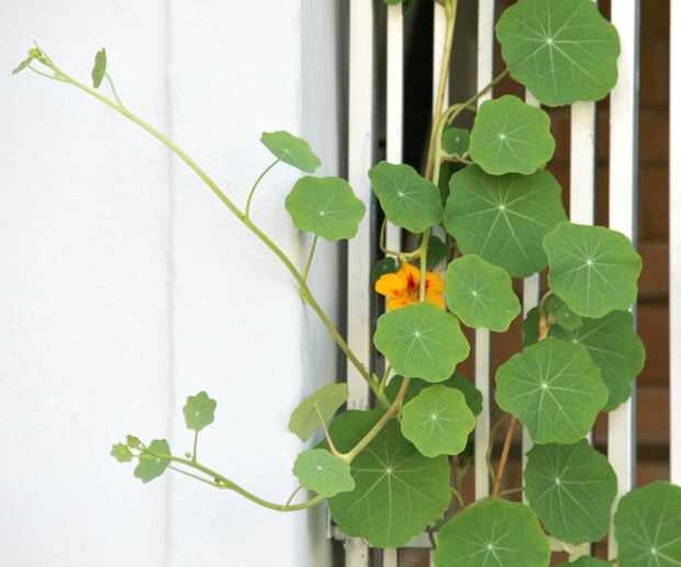 Una planta de crecimiento rápida y abundante, capuchina (nombre científico: Tropaeolum) trabajo como cubierta de tierra y como un escalador de espaldera (en la foto).