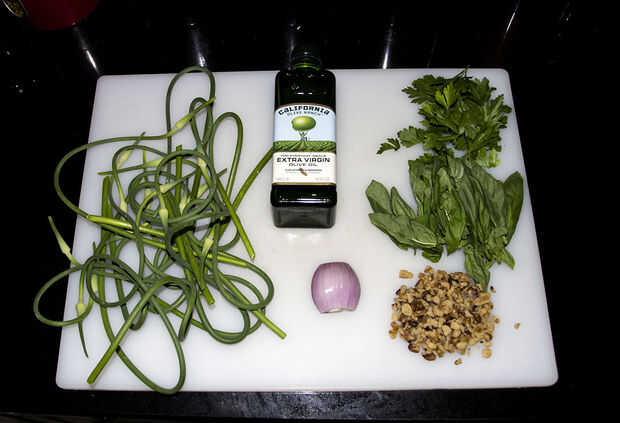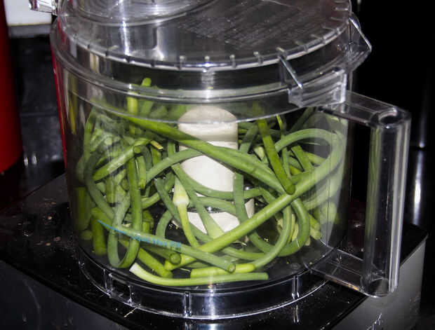 mirando por una ventana donde es 2 grados fuera y 4 pulgadas de nieve en el suelo yo estoy feliz de compartir uno de mis bocadillos favoritos de primavera, ajo pesto de scape.Otra joyita de mi mercado local de agricultores; paisajes de ajo son flores