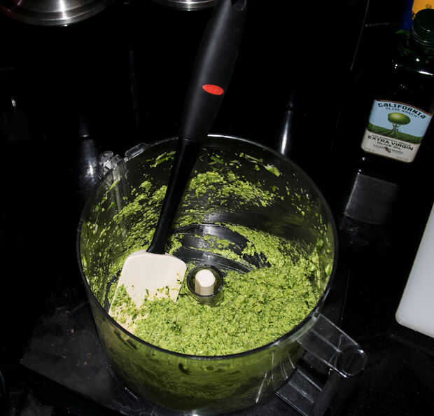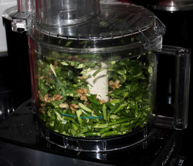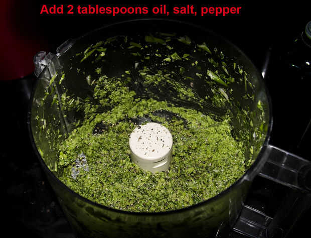 Añadir el resto de los ingredientes secos (pero todavía no hay aceite de oliva) y empezar a ejecutar el procesador de alimentos. Como funciona, llovizna en las primeros 2 cucharadas de aceite de oliva.