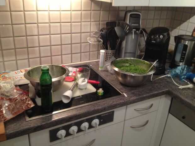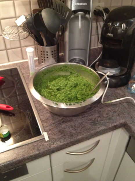Tomar una batidora y triturar cada pila de la hoja con el queso Parmesano molido y aceite de oliva. Asegúrese de que tomar suficiente aceite de oliva! If su demasiado poco, la licuadora se atranca y quema a través de:). Que suceda lo mismo, si se intenta mezclar todas las hojas y el queso junto:). Es mejor si no mezcla las hojas durante mucho tiempo, porque sus dichos se convierten en amarga después de un tiempo. No sé si eso es cierto, pero que en el lado seguro...