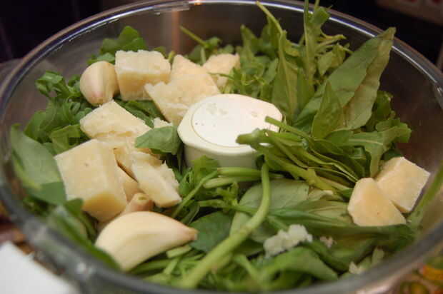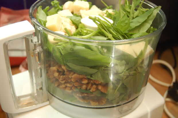 - Aproximadamente rasgue la albahaca, tallos y todo y coloque en el recipiente de la procesadora de alimentos junto con la rúcula, ajo, queso y nueces. Comienzo por pulsación todo junto y cuando empieza a romper hacia abajo se puede poner forma continua durante unos segundo hasta que terminas con una consistencia más suave. Es usted qué consistencia desea.