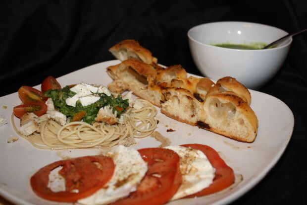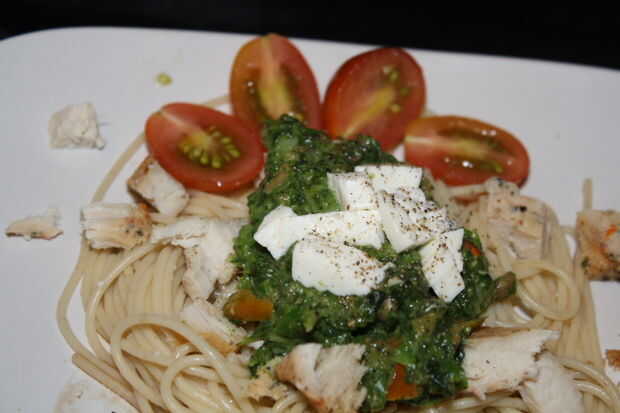 Superior un pequeño montón de pasta (que se muestra que aquí es integral Angel Hair) con algunas piezas pollo a la parrilla sazonado y cuchara de Pesto sobre él. Echar unos trozos de mozzarella por encima.