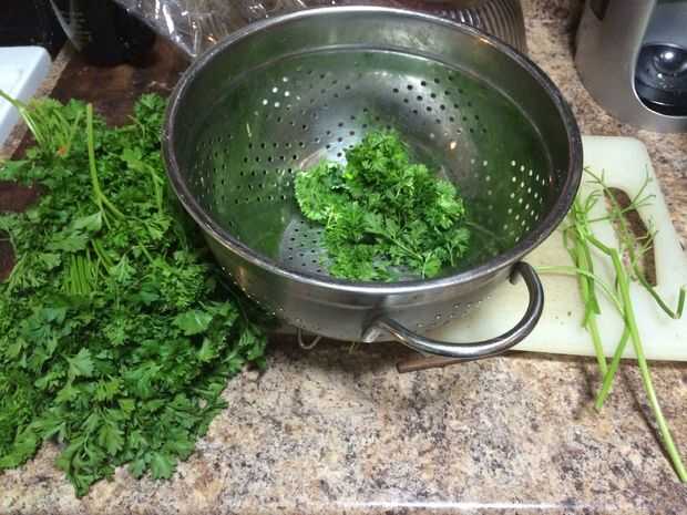 Curley perejil - 1-2 grandes Ramos o racimos de 2-3 más pequeño, dependiendo del tamaño de los racimos y cuántas porciones. (A veces lo hago 2 o 3 grandes racimos para mí, pero yo estoy dando vueltas a verde).