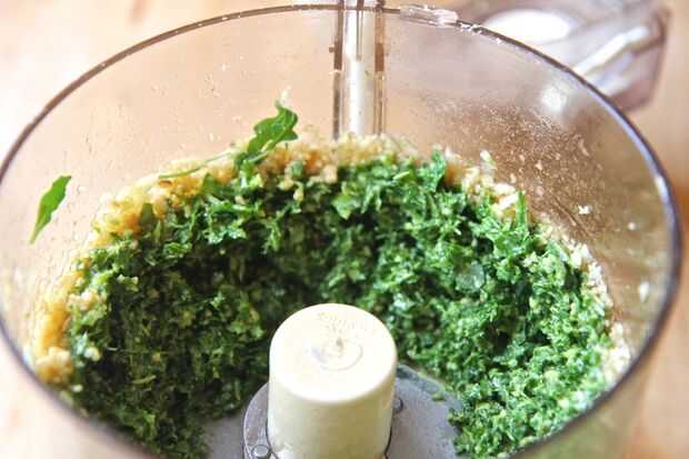 esto es una salsa de pesto ligero y saludable de una forma fácil de crecer mostaza que hace una gran comida verde para el día de San Patricio.Para esta receta necesitarás:un zoquete de verdes verde rayas mostazaajo1 taza de aceite de olivapizca de sa