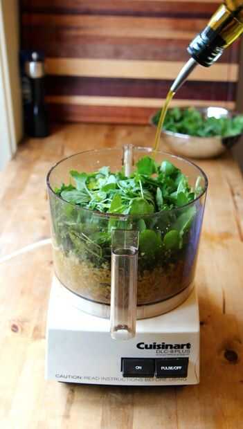 una variación sabrosa en el tradicional pesto. Utilice como lo haría cualquier otro pesto. Éste utiliza mucho menos aceite que la mayoría pero todavía paquetes de un sabor increíble. Estas cantidades son una guía muy aproximada y hacen un montón de p