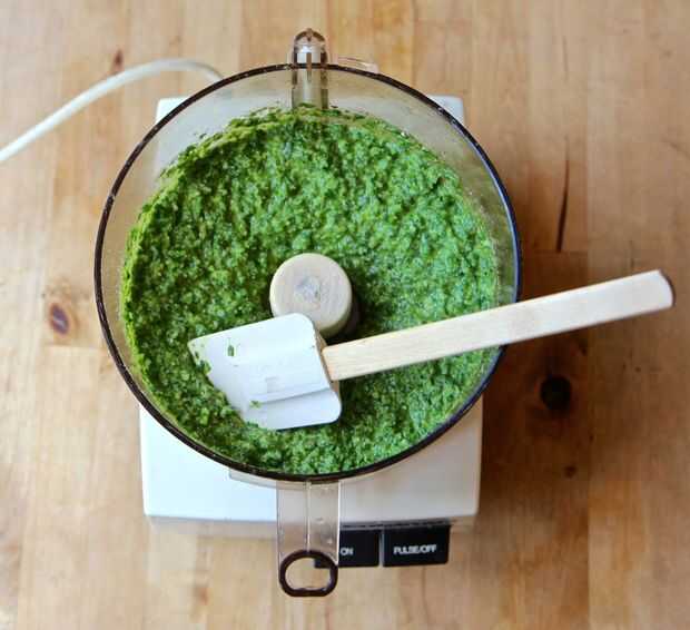 una variación sabrosa en el tradicional pesto. Utilice como lo haría cualquier otro pesto. Éste utiliza mucho menos aceite que la mayoría pero todavía paquetes de un sabor increíble. Estas cantidades son una guía muy aproximada y hacen un montón de p