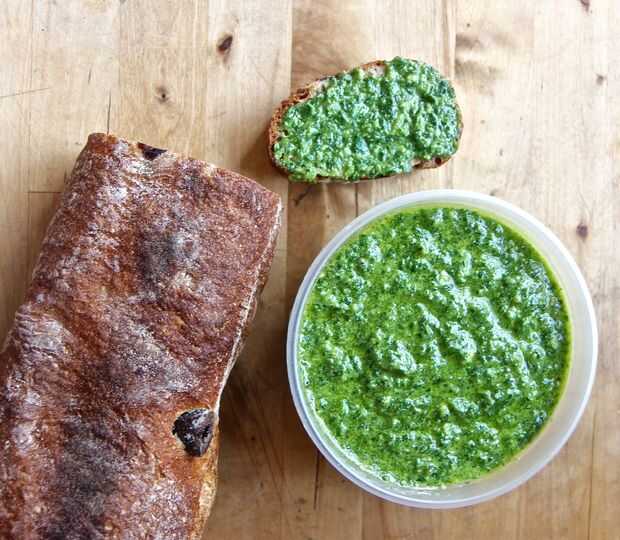 Mi favorito personal: difundir el pesto de rúcula fresca en un trozo tostado de pan de aceitunas.
