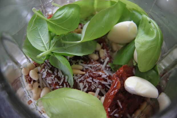 Cosas que necesitaráMasa de pizza1 1/3 taza de harina todo uso1 cucharadita de bicarbonato de sodio1/2 cucharadita de sal2 cucharada de aceite de oliva1/2 taza de leche (grasa libre funciona muy bien!)Al pestoAlbahacaAceite de olivaDientes de ajoQues