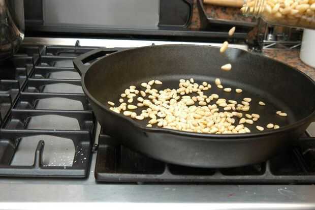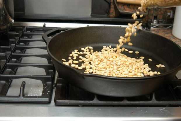 En una sartén grande sobre fuego medio, seca tostar los piñones, agitando periódicamente hasta que se doren y desprenden un rico aroma a nuez. No dejes que quedarse quieto o puede quemar.