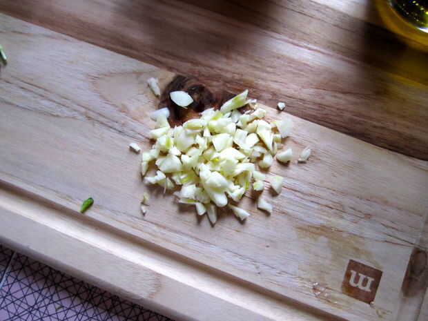 Picar el ajo no es totalmente necesario, pero me gusta darle un buen comienzo por lo que no trozos grandes a la izquierda.