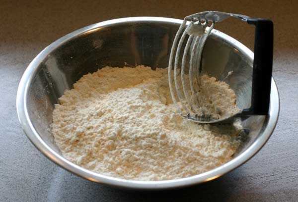 Utilizar un cortador de repostería para cortar la manteca en la mezcla de harina.
