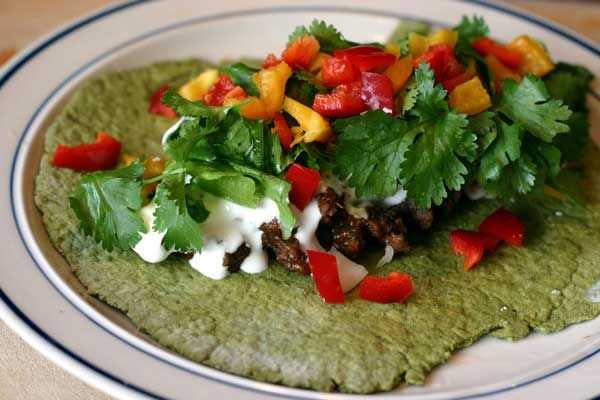 Tenga en cuenta que el sabor del pesto es algo sutil, así que si realmente quieres destacarlo desee elegir rellenos suaves. También, como se puede ver en la foto, un poco de rojo y amarillo comida como tomates o pimientos contrasta muy bien con el color de la tortilla y ayuda a animar la presentación.