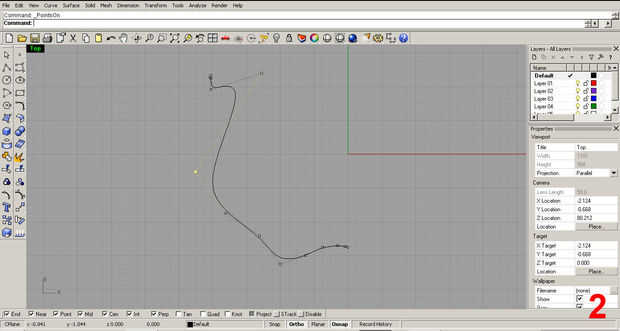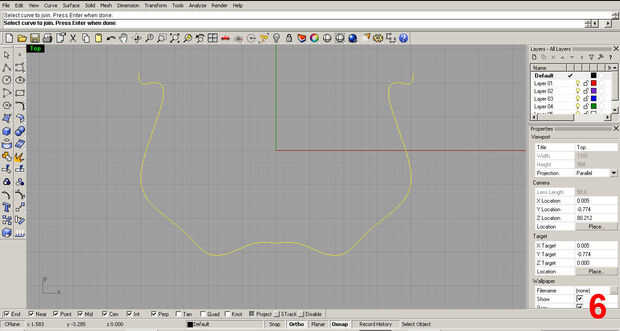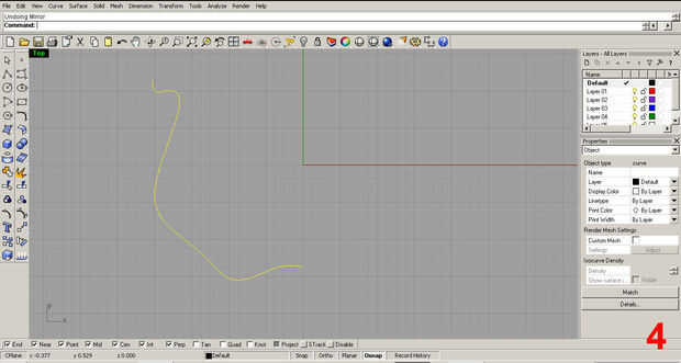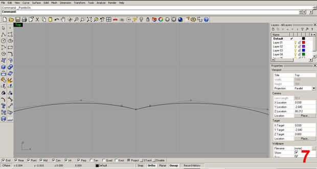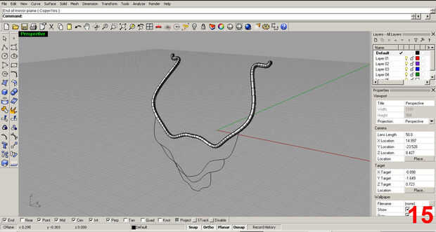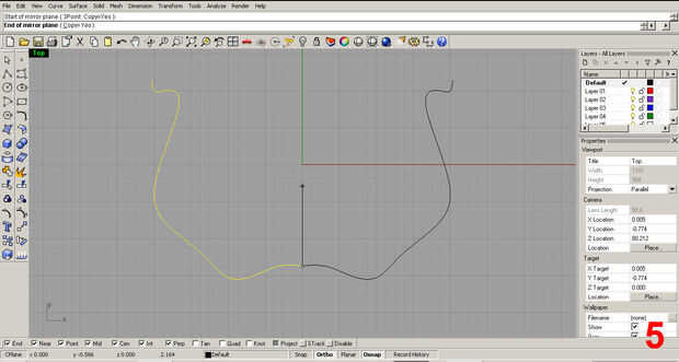 En la vista superior, selecciono la curva y utilizar el comando "mirror". Seleccionar el punto de fondo, gira 180 grados del espejo para hacer dos curvas idénticas. Imágenes 4, 5