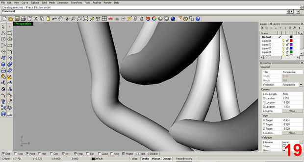 En la inspección cercana del modelo ( IMGAE 19), puedes ver que las curvas hilo bastante no tocar uno con el otro. Esto debe ser corregido. Además, tengo que añadir más definición a las tuberías por lo que parece lo que está en mi mente. 19 imagen demuestra el cierre para arriba de la superficie frontal moviéndose hacia arriba y lejos de las "costillas" 3.