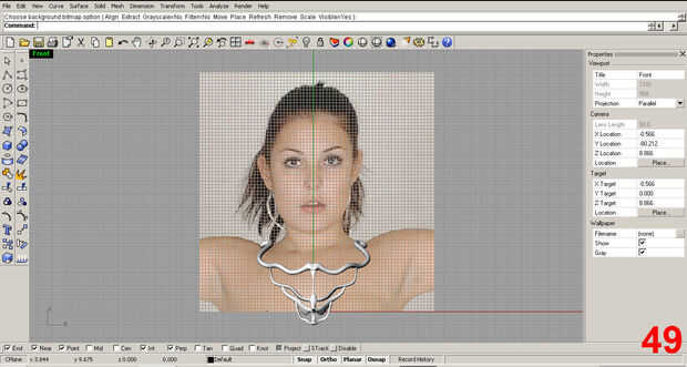 Una vez colocado, puede mover y escalar la imagen de mapa de bits para obtener el tamaño correcto. Dibujaba una línea 5" de largo (que es aproximadamente la anchura del cuello femenino) y escala de la imagen (hace referencia al cuello de la muchacha) a esa línea. Moví la imagen al centro y coloca el modelo en todos puntos de visión para cómo se va usar.