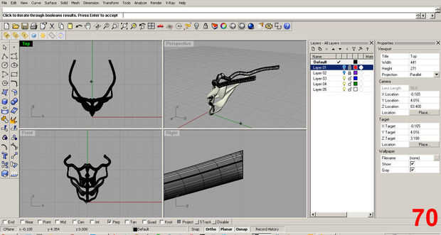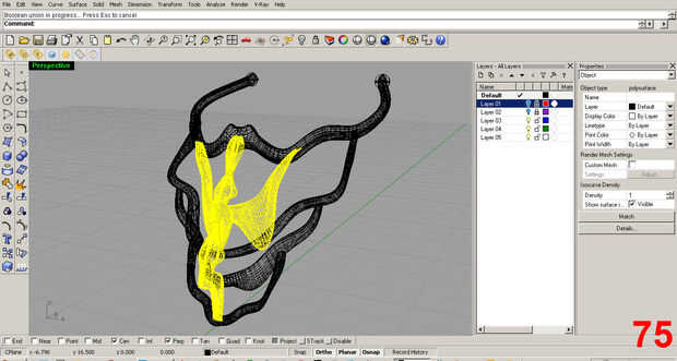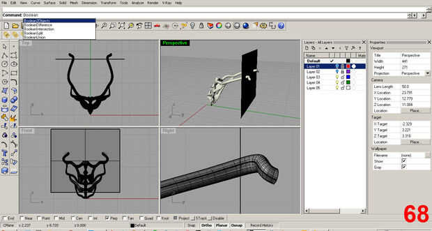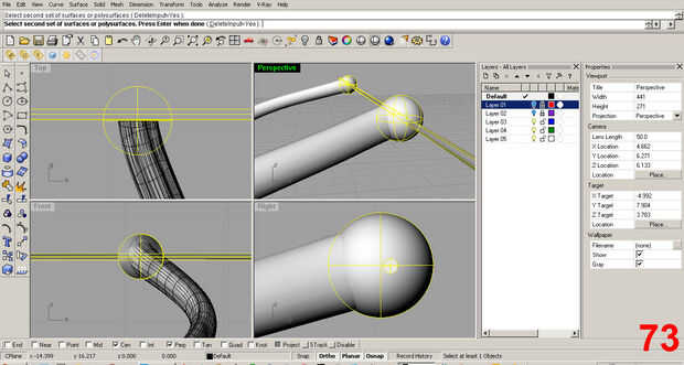 Ahora, se esculpe un poco diferentemente que el componente original este "clon". Primero, realicé una operación de "Sustracción booleana" en el clon para quitar la parte superior de la pieza. Esto funciona tomando la masa de un objeto y usarlo para cortar otro objeto. Nota: Rhino tiene un comando de ayuda con ejemplos de la animación de cómo funciona la herramienta. Hacer uso de ella, es amable y genial.