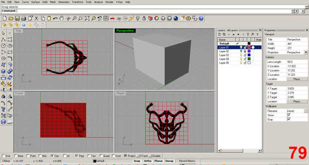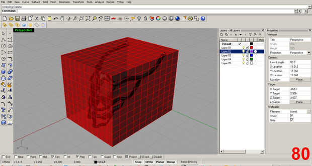 Para colocar el modelo y compruebe que se ajuste en el límite de la impresora, he creado un cubo con las dimensiones principales de la impresora en una capa roja separada para mayor claridad. La impresora que voy a alquilar para este proyecto tiene un 8 "x 6" base y un límite de 6" de altura. Así, mi caja es 8 x 6 x 6. Imágenes 79, 80
