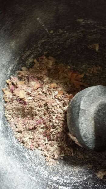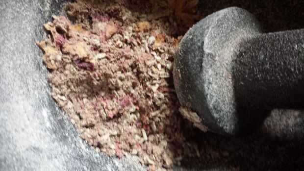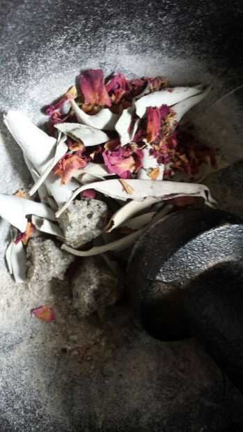 Utilizar el mortero y mortero para moler los pétalos, rosehearts, sabio y copal en la consistencia deseada.