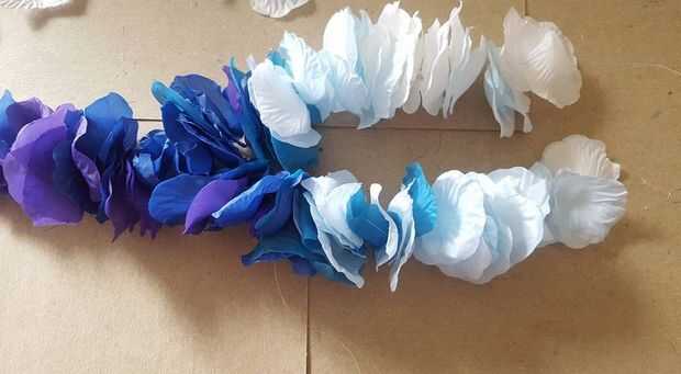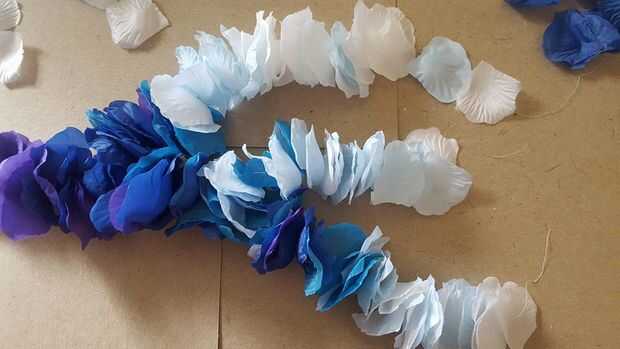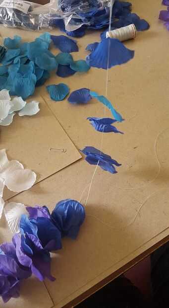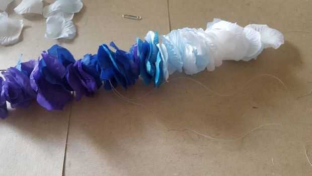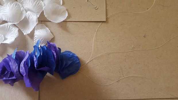 Continuar al hilo de unas 8-12 pulgadas. Mantienen su flor de vez en cuando compruebe el efecto de ombre y asegúrese de que no tener demasiados pétalos sobre el nudo. Si usted hilo muchos pétalos sobre el nudo, sus tres filamentos será largas y habrá un poco de espacio vacío cuando usted cuelga. La glicina se ve muy bien cuando el nudo queda sobre a medio camino abajo de la flor.