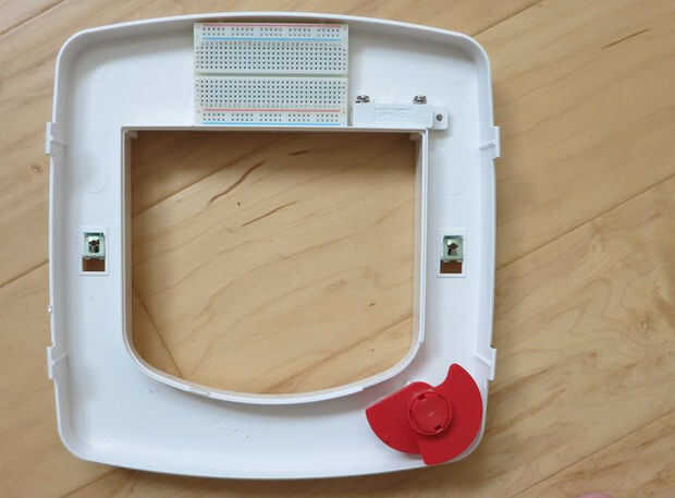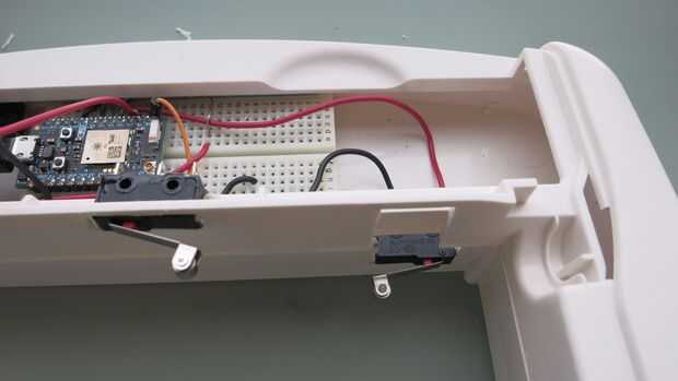 Se conecte más tarde el "gato salir" al pin D3 y el interruptor del "gato en" al pin D2. El otro conector en cada interruptor se conectados a tierra. Porque el fotón ha construido en tire y tire hacia abajo de resistencias, no necesitamos añadir una resistencia de conexión de los interruptores.