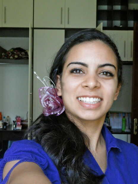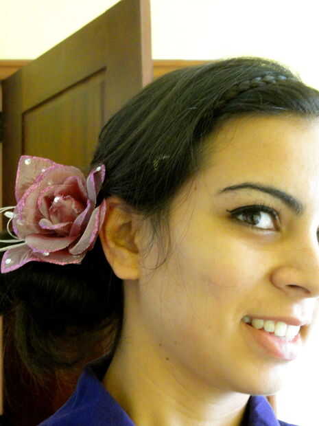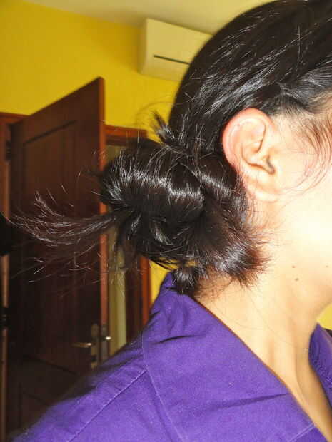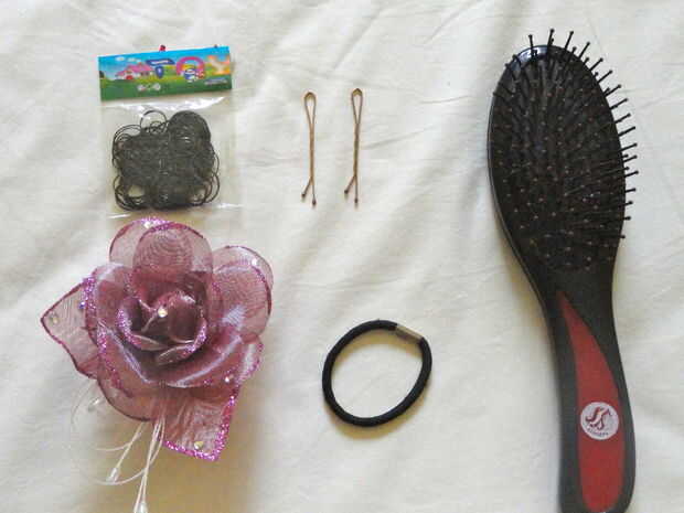6. Prenda com una liga de silicona para o lado, matricular o cabelo e prenda com uma liga mais grossa, ajeite com os grampos. Coloque una flor ou outro acessório de sua preferencia.