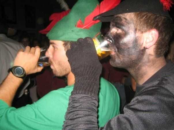 Para Halloween 2009 mi novia y yo fuimos como Peter Pan y Tinker Bell. Hicimos nuestros trajes sin patrones. Por mi túnica me hizo la forma para asemejarse a una de mis camisas de matorral sobre alguna tela de algodón verde y extiende la parte inferi