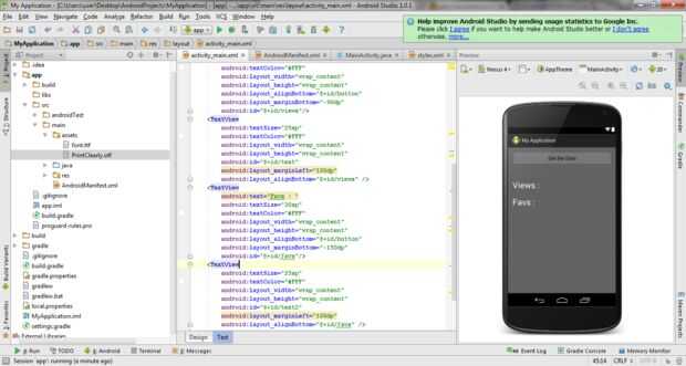 En segundo lugar debe configurar una TextView en activity_main.xml que vas a utilizar para mostrar el código HTML de la Página Web especificada y un botón que al pinchar en él, la aplicación muestra el código. También deberá declarar una varible nueva "TextView" en MainActivity.java y asociarlo con el textview en la activity_main con su ID.