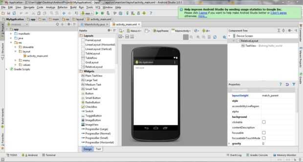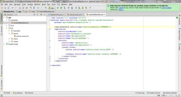 Así que para hacer una aplicación Android que realiza automáticamente la petición GET a la página web deseada, tenemos empezar un proyecto de aplicación en estudio de Android. Para hacer que usted puede seleccionar "Iniciar un nuevo proyecto Android de estudio" desde el Asistente de configuración de Android o puede seleccionar "Archivo > nuevo proyecto". Continuación, seleccione su nombre de la aplicación y la ubicación del proyecto. Después de que usted necesita seleccionar el SDK mínimo, bien depende de su dispositivo, pero ten en cuenta eso si los seleccionados "sdk mínimo" es más alto que el SDK de su dispositivo la aplicación no funcionará.