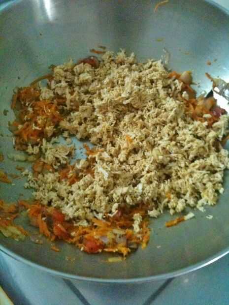 agregar el pollo cocido y desmenuzado y cocine