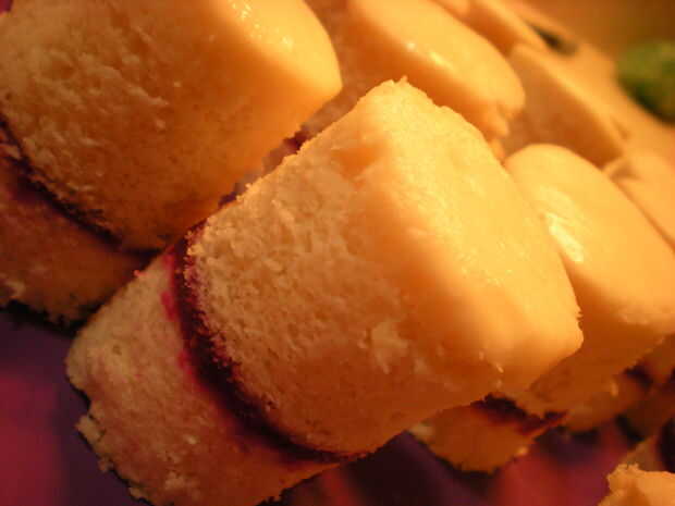 Ahora es el momento para perfeccionar los pequeños pasteles. Retire el congelado petit fours del congelador y alise los lados cepillado de las migas. Volver al congelador, congele sólido antes de agregar la capa.